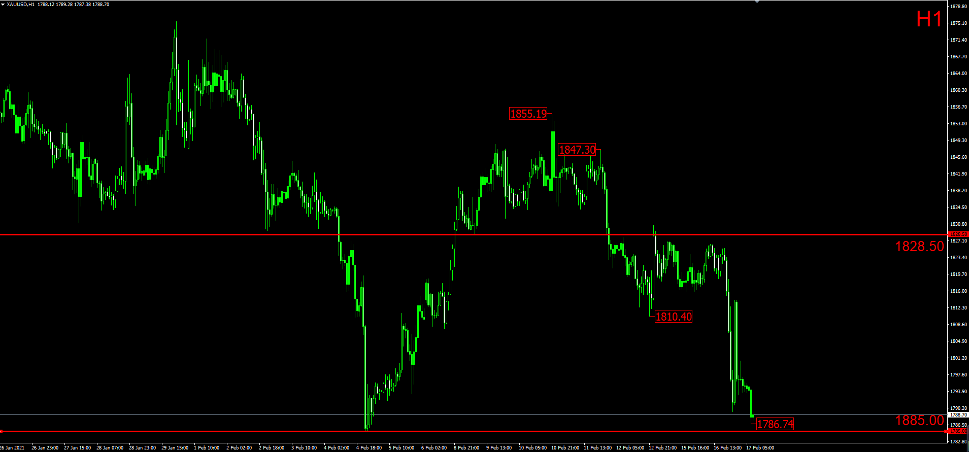 从小时图上看,昨日在亚欧盘阶段窄幅震荡收敛,最终在美盘阶段选择方向,快速下挫。一口气跌穿1800。虽然在下破1800后,一度出现强势反弹,但也仅昙花一现,最终金价仍跌至1786,测试1785一线前期重要低点的支撑。形态上看,金价短线已跌至重要支撑,如不能有效跌破或将再度陷入震荡。因此在操作上不建议过多追空,可轻仓博弈反弹,或待反弹结束后再度做空,博弈金价下破1785,探向1764。