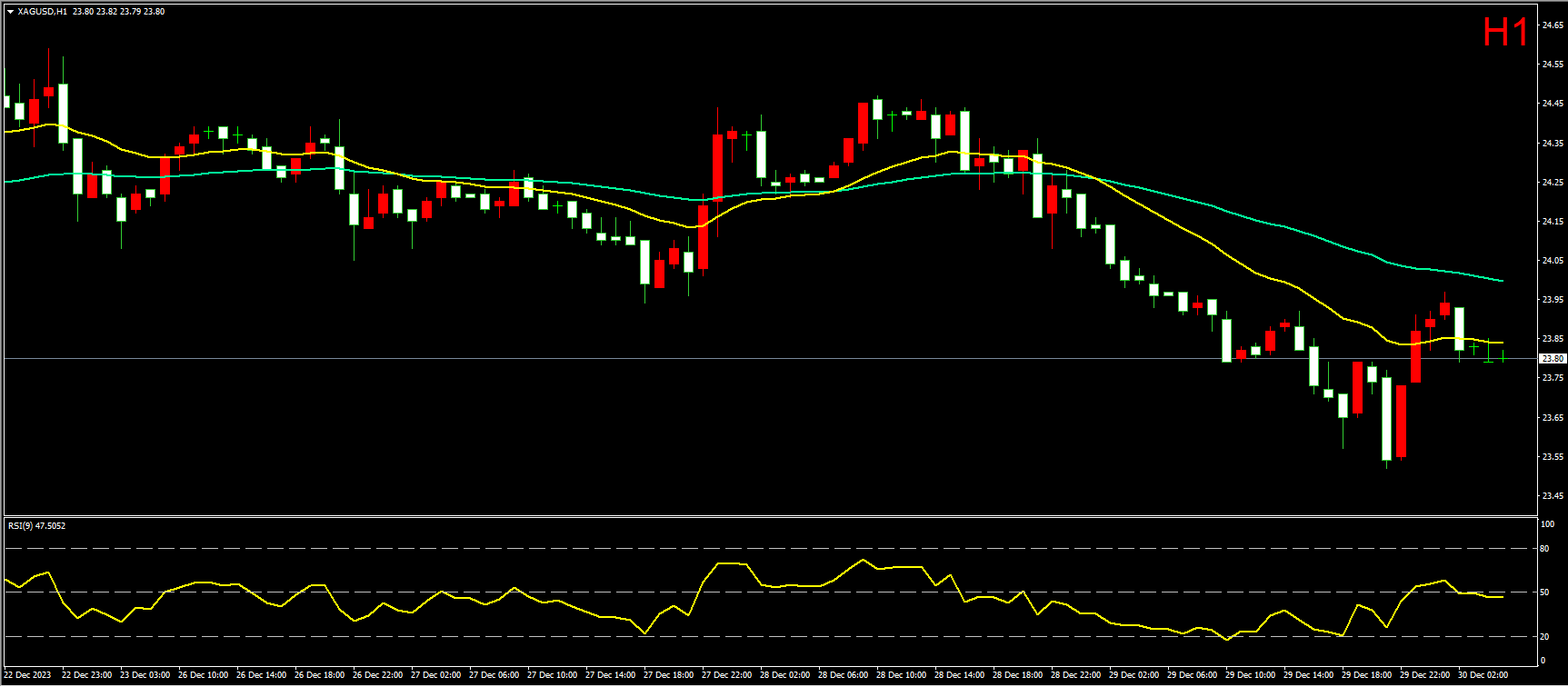 日线图上,上周五白银与黄金一样走势偏弱,日线都收带长下影的阴线,一度下探至60EMA位置。整体形态上看,白银目前死守60EMA均线,若跌破该均线,则白银短线头部确立,后市或逐步下探至此前大阳线底部位置22.60。