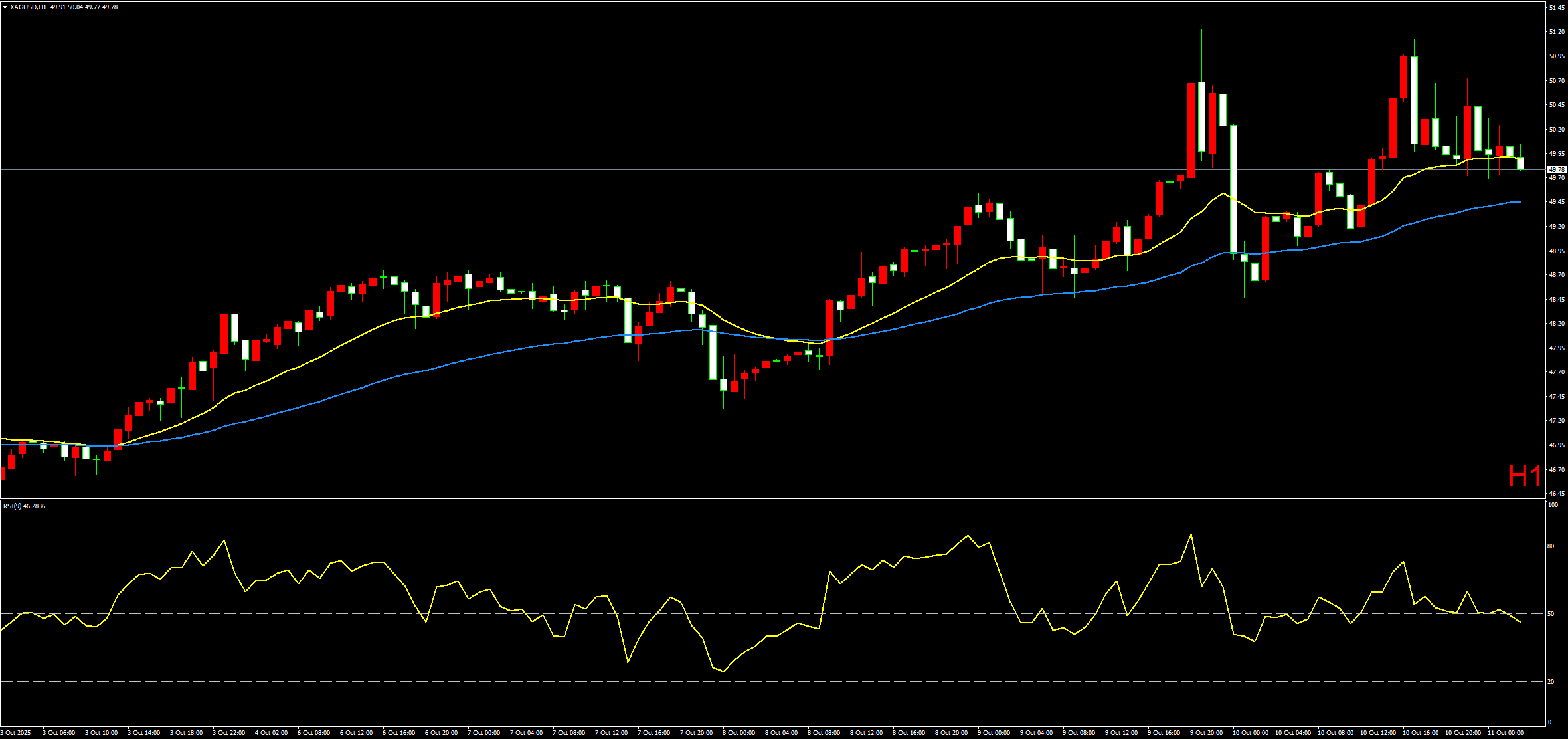 小时图上,上周五白银在一度在欧盘阶段强势冲高,最高涨至51.12,距离历史高点51.22仅一步之遥,但随着逐步进入美盘阶段,白银震荡回落,重回均线附近。短线形态上看,白银有形成短线双顶形态的迹象,若今日再度跌破60EMA均线,则银价后市或将逐步走低,但倘若一直维持在20EMA均线上方,则白银有望继续上探,甚至刷新新高。因此在操作上建议,先以低多为主,博弈白银继续走高,跌破60EMA均线后平多转空。