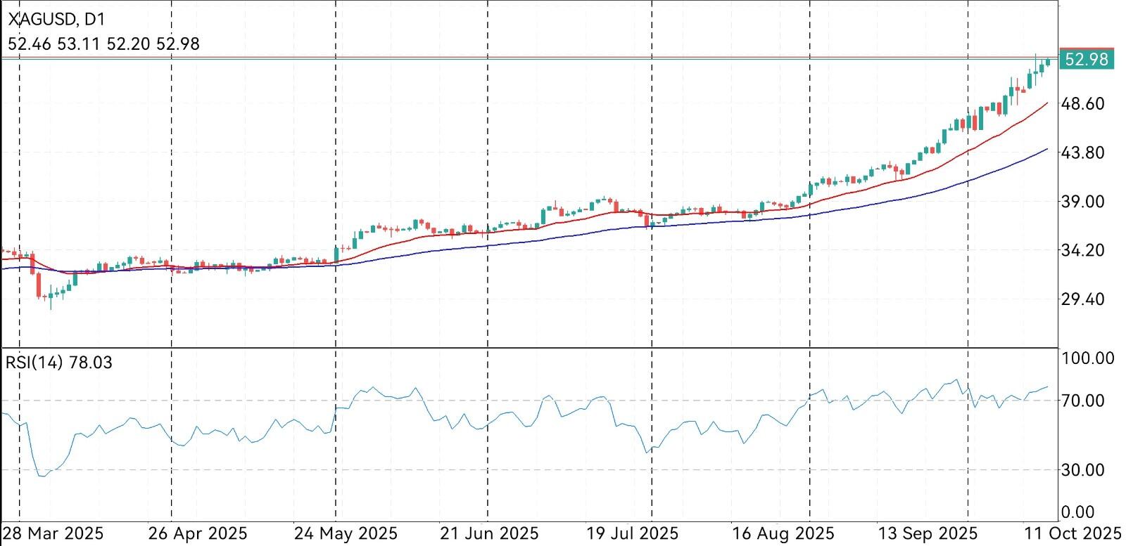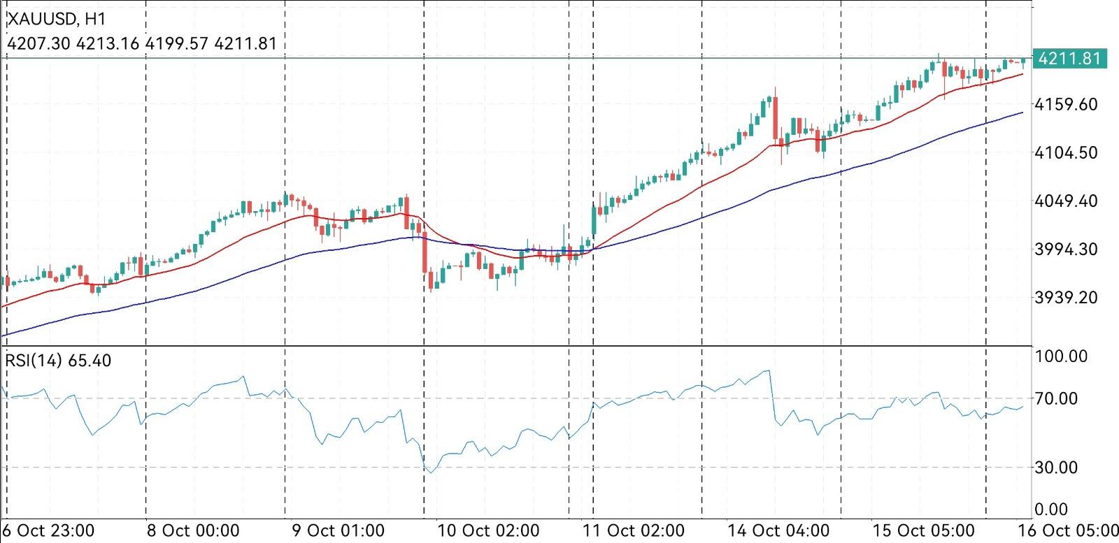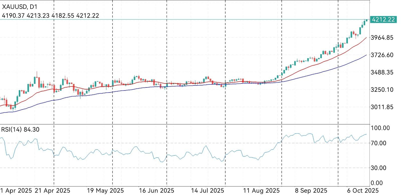 昨日,中美贸易担忧和美国政府持续关门,继续推动金价持续上行,黄金日线收带上影的阳线,突破4200美元,继续刷新历史新高。整体形态上看,黄金本周走出三连阳形态连续刷新历史新高,说明多头非常强劲,而且目前暂时仍未出现明显滞涨信号,因此仍建议继续跟随黄金多头趋势,继续逢低做多。