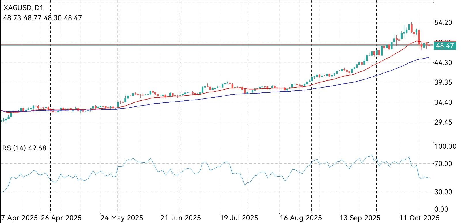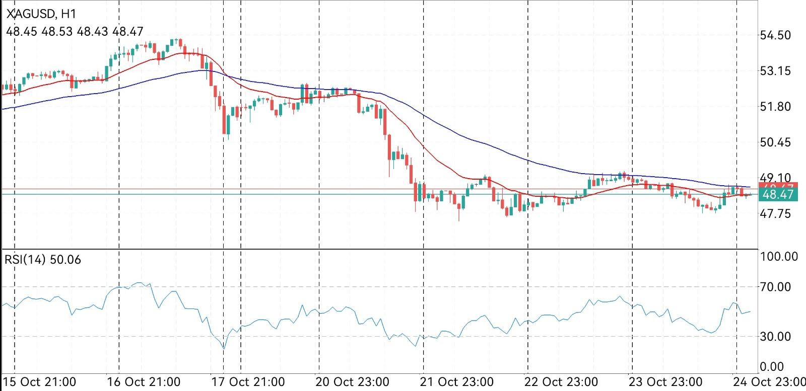 小时图上,上周五白银在开盘后受均线压制,逐步震荡回落至47.74附近才有所企稳,并在美国数据利多的刺激下再度回升至均线附近,但仍未突破均线压制。整体形态上看,白银受均线压制保持低位震荡,后市继续下行的概率较大,但RSI指标已回到均衡位置,要小心短线白银新低后快速反弹动作。因此在操作上建议,保持高抛为主,低多为辅的震荡操作。