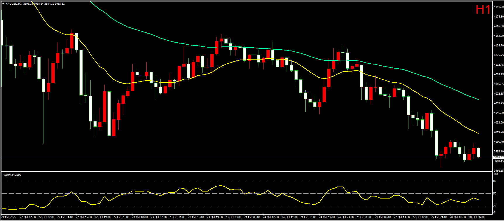小时图上,昨日黄金开盘从均线附近逐步震荡回落,日内持续走低,之间跌破4000美元整数关口,最低跌至3971美元附近,刷新高位跳水以来的调整新低。形态上看,黄金短线走势较为偏空,再突破站上20EMA均线之前,建议继续跟随空头逢高做空。若站上20EMA均线,则金价或将转为围绕均线低位震荡走势,届时再转为高抛低吸震荡操作。