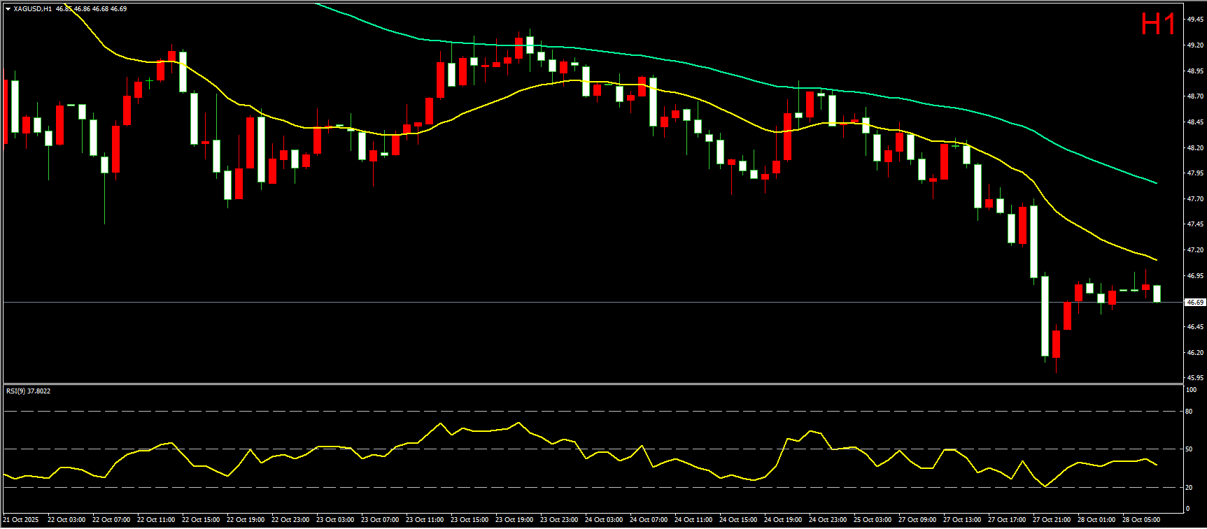 小时图上,昨日白银在亚盘开始就逐步沿均线震荡走低,直到晚间美盘阶段,银价加速下探,最低跌至46.00美元。虽然在尾盘阶段略有反弹,但白银整体形态仍偏空头,日内大概率将继续顺势下探。不过,下方45.60附近有日线关键均线支撑,因此日内要小心触及支撑后快速反弹动作出现,进而形成RSI指标底背离形态。所以在操作上建议,先以高抛为主,低吸为辅的震荡操作。