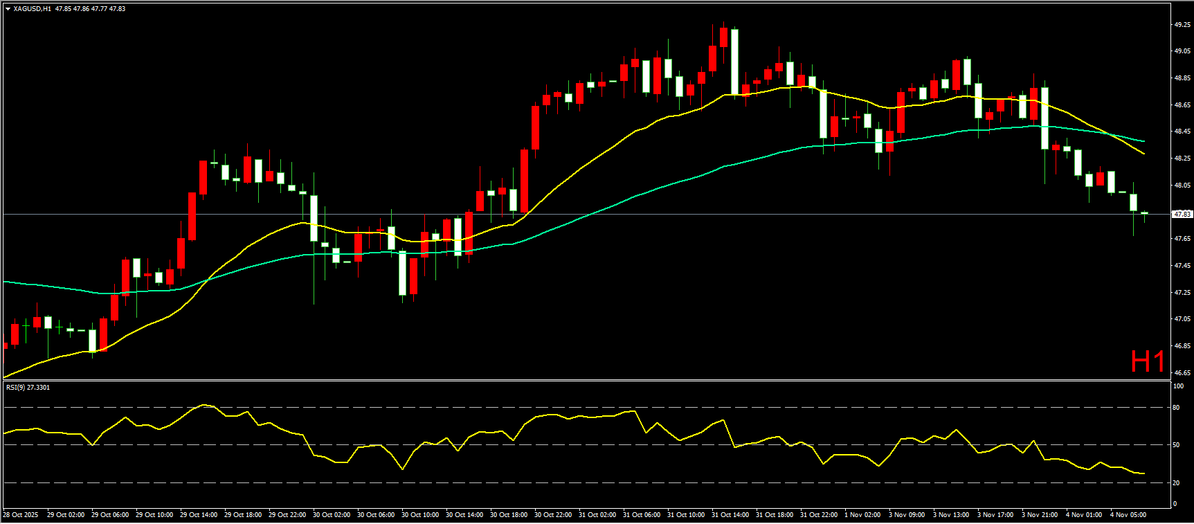 日线图上,昨日白银走势相较黄金略弱,日线收上影略长的小阴线。整体形态上,白银在20EMA均线附近遇阻承压,令白银短线震荡走低,有再度回踩60EMA均线的可能,因此在突破均线压力之前,建议先保持高抛低吸震荡操作为主。