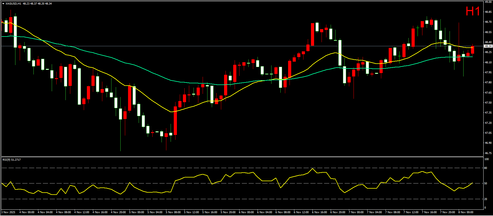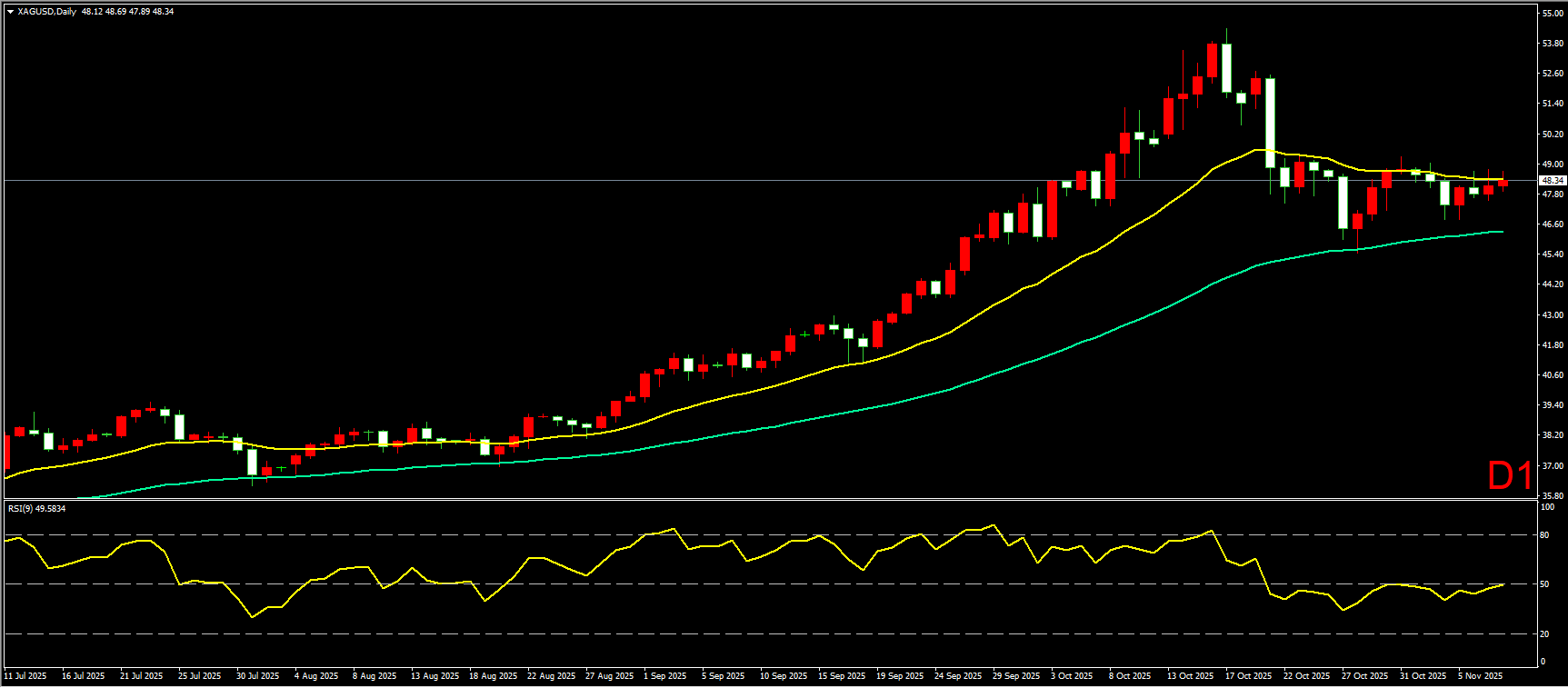 上周五,美国政府停摆问题略有转机,但美国非农数据已连续两个月停更,导致美联储官员对12月降息举棋不定。黄金日内继续维持震荡走势,合并周六K线,日线收带上下影的阳线,再度逼近20EMA均线压力。整体走势上看,黄金上周初下探形成三连阳反弹,但仍未突破20EMA均线压制,继续保持两条均线之间震荡收敛走势,但震荡中心有所上移,本周向上突破的概率有所增加。