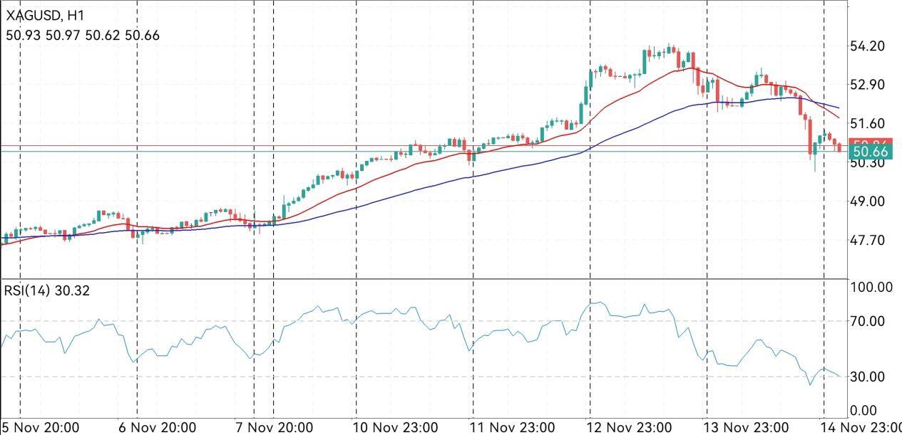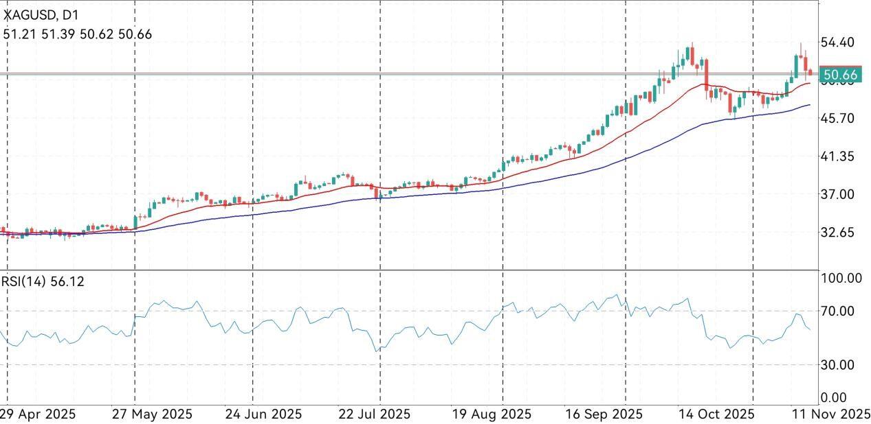 小时图上,上周五白银在开盘一度反弹至20EMA均线上方,但随后逐步震荡回落,并在美盘初期跌破60EMA均线,打开下行空间,最低跌至49.97。短线形态上看,白银破位后形态偏空,但目前仍处于左侧关键震荡区间,有一定支撑效果,令白银日内先维持横盘震荡。若白银能重新站上均线,则银价后市将维持高位震荡,相反若均线附近压力较大,或整体震荡重心逐步下移,则白银后市将继续震荡下行,甚至开启日线级别单边下行趋势。因此在日线操作上仍建议,先以高抛低吸震荡操作为主。