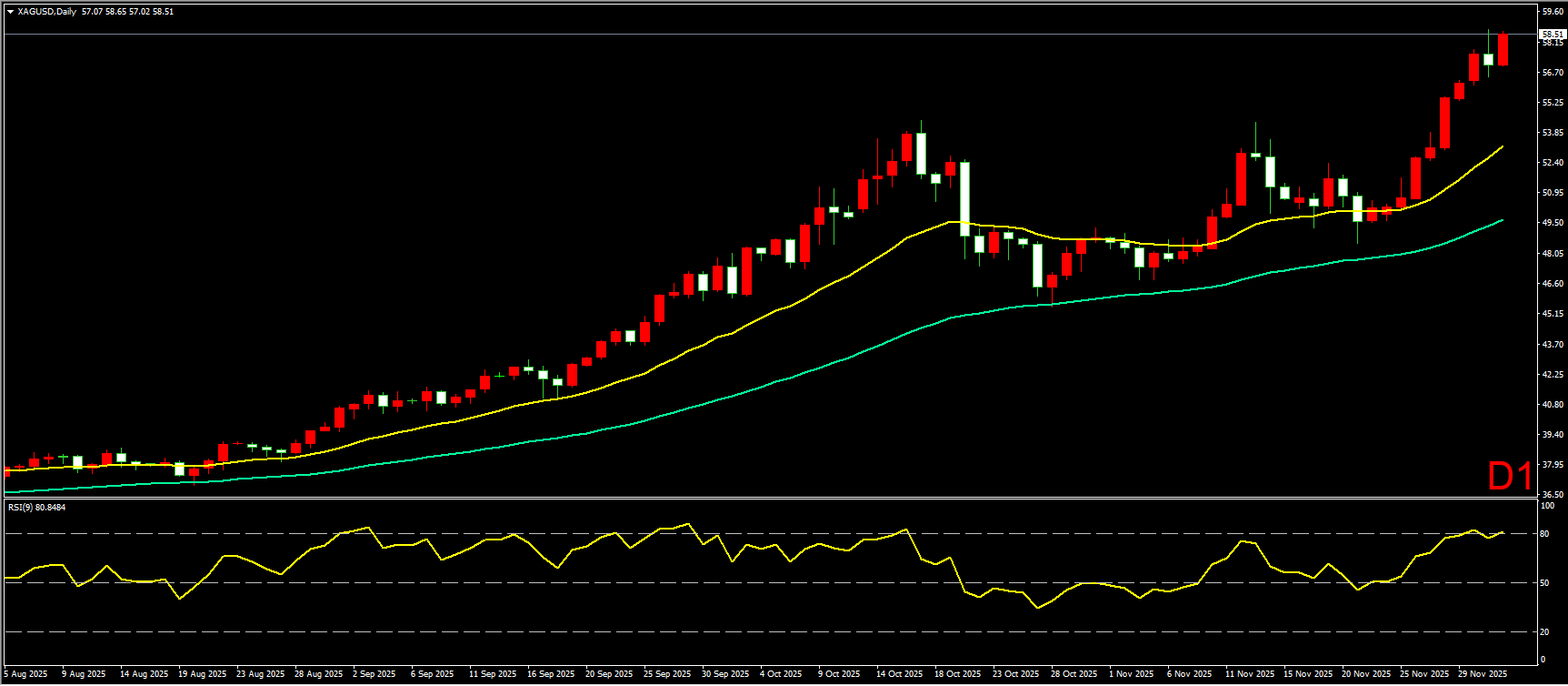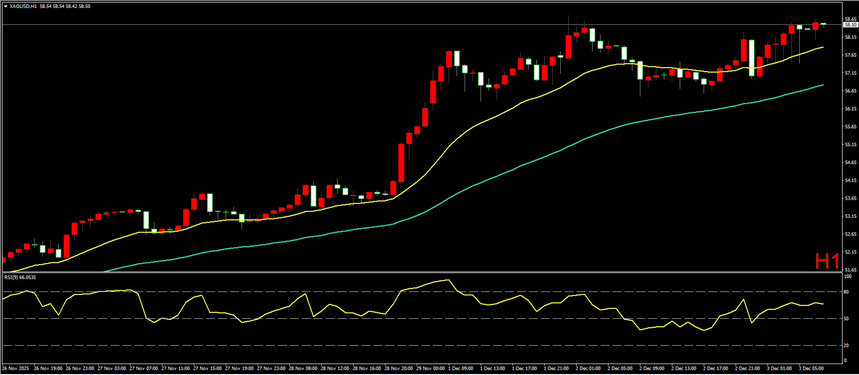 小时图上,昨日白银一度回落至20EMA均线下方,但跌幅并不打,最低仅跌至56.49附近,随后逐步回升,再度逼近历史高点位置。而且在隔夜走势中,白银连续收长下影K线,说明多头力量非常强劲,基本消化历史高点压力,今日有望继续新高。因此建议在操作上,继续以逢低做多为主。