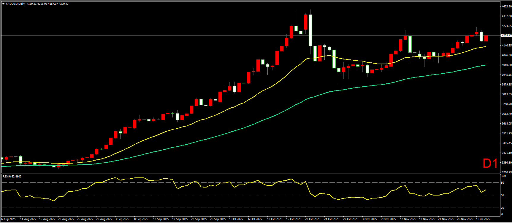 昨日,黄金突破4250形成新的次高点后遇阻回落,日线一度收较为饱满的大阴线,但隔夜市场快速反弹,目前已将阴线收复大半。整体形态上看,黄金的大阴线对短线多头形态有所破坏,且放缓金价对历史高点的冲击节奏,短线向突破历史高点难度变得更大。若今日反弹失败,日线最终收长上影,甚至收阴,则黄金或将再度形成下探60EMA均线的动作。