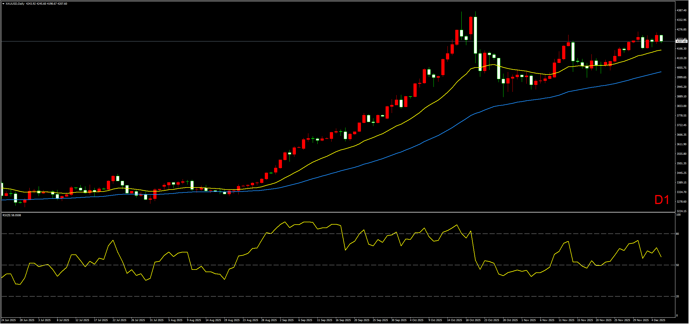 上周五,美国经济数据未能对12月降息带来任何影响,黄金延续整体多头强劲势头,一度逼近短线高点,但尾盘突然跳水,合并周六K线,日线收长上影十字星。整体形态上看,黄金刷新次高后维持高位震荡,均线不断上跟,但由于对明年降息的确定性不高,导致金价暂时未能继续向历史高点靠近。考虑到本周将迎来降息落地,预计在降息落地前,金价继续保持均线上方震荡。