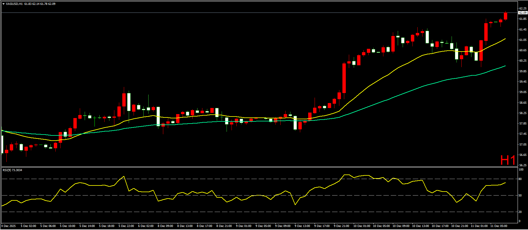 日线图上,昨日白银在美联储降息落地前,一度冲高回落,日线收上影较长的小阳线,而随着美联储降息落地,白银强势冲高,再度刷新历史高点,最高涨至62.28附近,当前日线呈大阳线形态。整体走势上,白银继续刷新历史高点,延续多头趋势,加速的迹象越发明显,因此建议继续跟随多头趋势逢低做多。