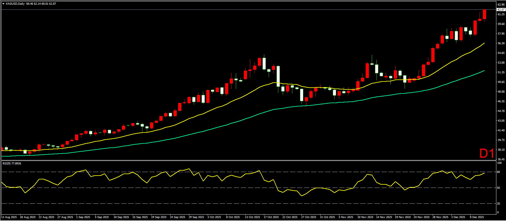 小时图上,昨日白银在亚盘阶段一度延续前日强势多头,继续惯性上攻,但随着逐步进入欧盘阶段,银价开始震荡回落,回踩60.00整数关口,直到美联储降息落地后,白银才重启涨势,直接刷新历史新高。短线形态上看,白银RSI指标略有顶背离雏形,若后市跌破60.00关键支撑,则确认背离形态,届时将引发银价较大的调整动作。而在此之前,仍建议继续跟随白银强势多头,保持逢低做多。