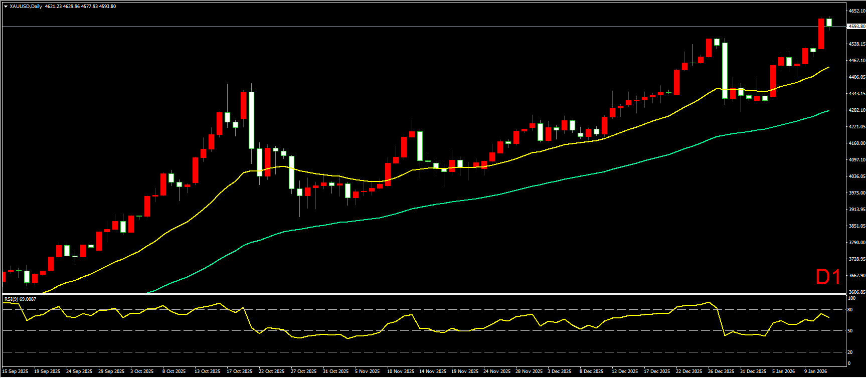 小时图上,昨日黄金开盘直接强势冲高,随后转为震荡上行,最高摸到4629附近,尾盘略有回落,回踩20EMA均线位置。短线形态上看,黄金在开盘初期快速冲高后,转为震荡上行,但RSI指标出现持续顶背离形态,若日内跌破20EMA均线,则金价或将逐步回踩4540附近60EMA均线位置寻求支撑,也是对突破新高后的回踩确认动作,预计完成回踩后仍将继续走高,因此在操作上建议,先以低吸为主,若跌破20EMA均线,可尝试短空。