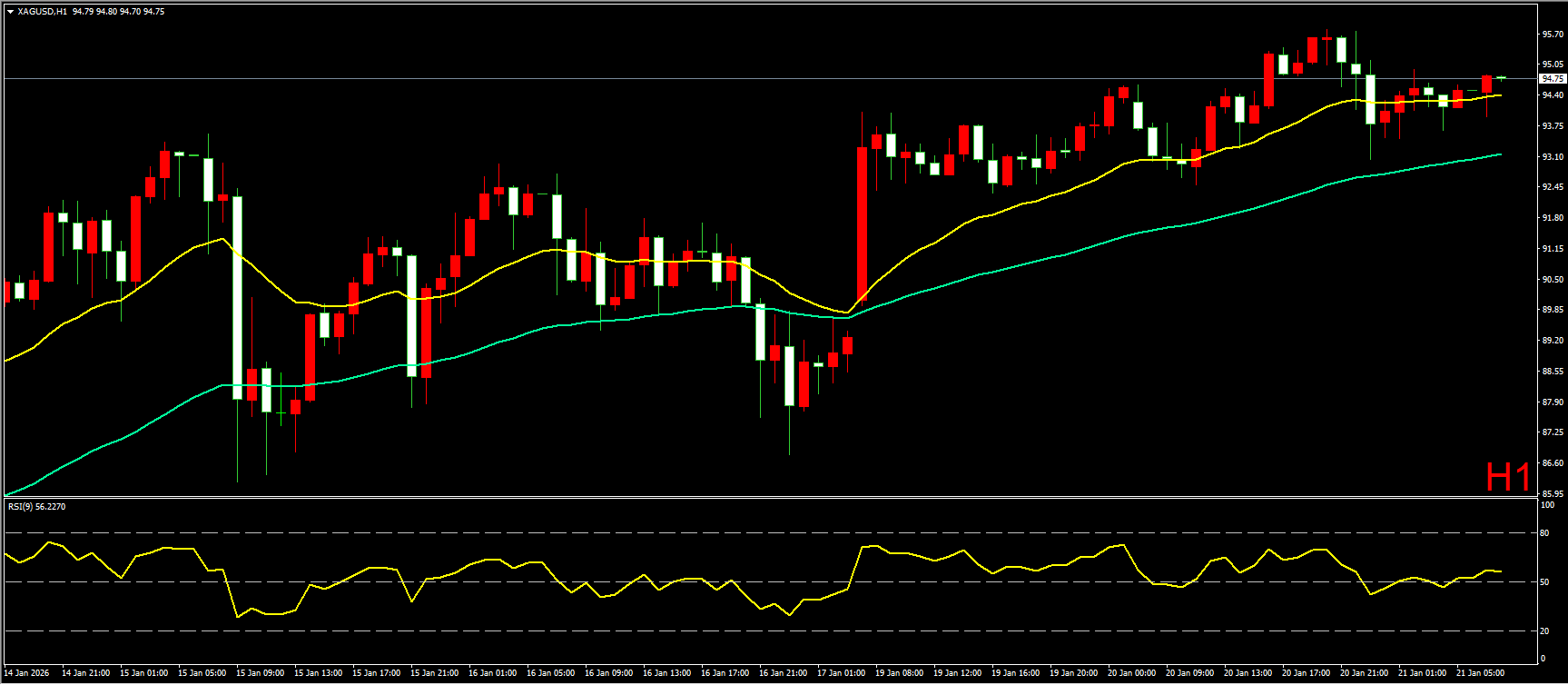 小时图上,昨日白银完成20EMA均线回踩后,继续上探,最高涨至95.79附近,但美盘阶段白银有所回落,一度跌破20EMA均线,最终转为围绕均线震荡走势。短线形态上看,白银上涨斜率略有放缓,但多头趋势依旧保持良好,日内仍有继续上探走高的机会,因此仍建议以逢低做多为主。不过,日内60EMA均线最为关键,若跌破60EMA均线,则短线多头趋势遭到破坏,届时白银将进入更大的调整走势。