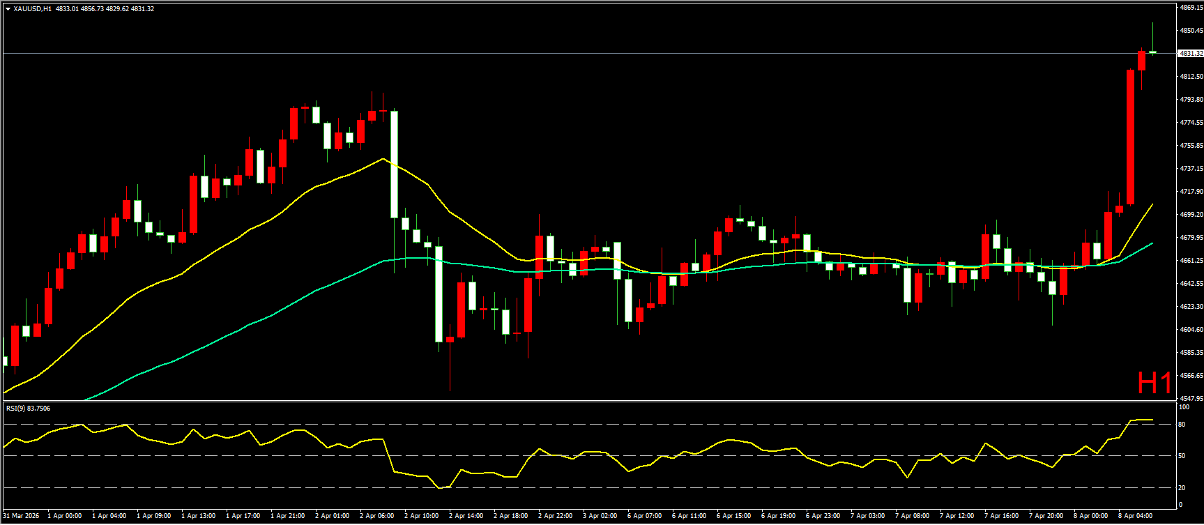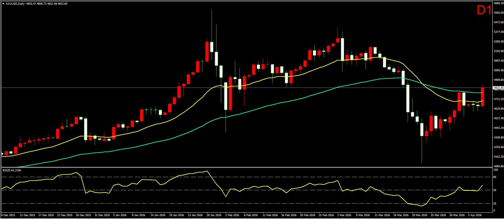 昨日,原本市场担忧美伊战事升级,黄金日内维持窄幅横盘震荡,日线仅收小十字阴星。然而隔夜尾盘,特朗普TACO宣布停火两周,同时伊朗也同意停火谈判,令金价快速表示,一口气冲上4800美元,当前日线称饱满大阳线形态。整体形态上看,黄金隔夜走势强势突破60EMA均线,刷新整体反弹新高,进一步打开上行空间,上方下一个关键压力位置在5000美元附近。