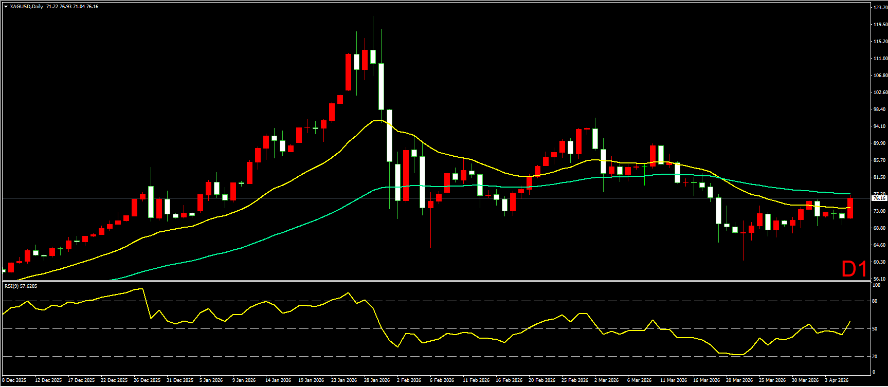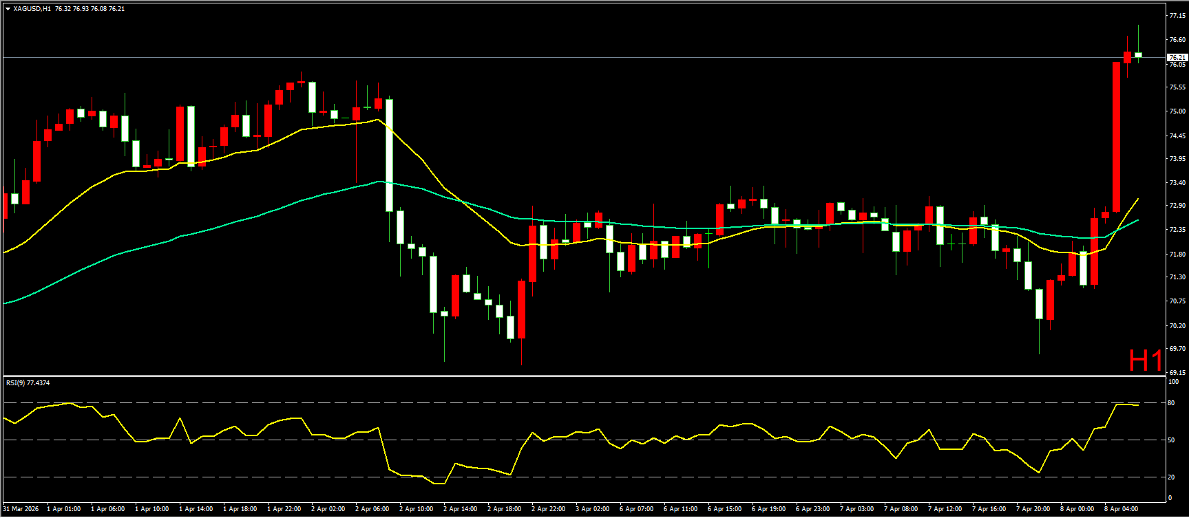 小时图上,昨日白银一度维持在均线附近震荡,而美盘阶段银价逐渐走弱,逼近前期回调低点69.57附近。而随着隔夜停火消息公布,白银强势反弹,一举突破前期反弹高点,最高涨至76.93附近。短线形态上看,白银突破前高后打开上行空间,但日线60EMA均线压力依旧较大,预计白银日内或先震荡横盘,带均线上跟后,再尝试向上突破,因此在操作上建议,先耐心等待回调低多机会出现。